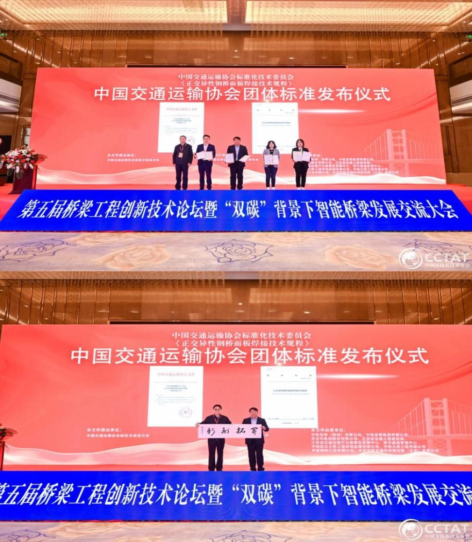 中交第二航务工程局副总经理、总工程师张永涛,中国交通运输协会副会长钟华分别致辞,中国交通运输协会副会长兼秘书长、协会标准化技术委员会主任委员李刚做《正交异性钢桥面板焊接技术规程》标准发布仪式致辞,并向起草单位代表中铁宝桥(扬州)有限公司、苏交科集团股份有限公司、中铁九桥工程有限公司、中建钢构江苏有限公司颁发标准公告和文本。民革中央原副主席修福金为标准起草牵头单位中铁宝桥(扬州)有限公司颁赠他的作品和寄语。
