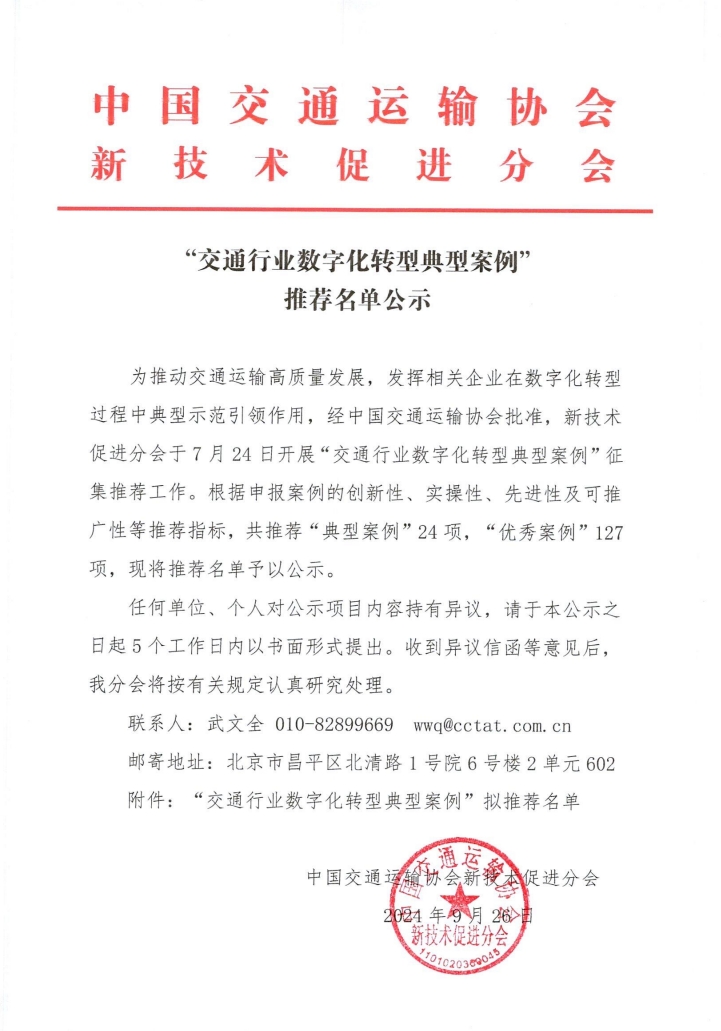 为推动交通运输高质量发展,发挥相关企业在数字化转型过程中典型示范引领作用,经中国交通运输协会批准,新技术促进分会于7月24日开展“交通行业数字化转型典型案例”征集推荐工作。根据申报案例的创新性、实操性、先进性及可推广性等推荐指标,共推荐“典型案例”24项,“优秀案例”127项,现将推荐名单予以公示。
